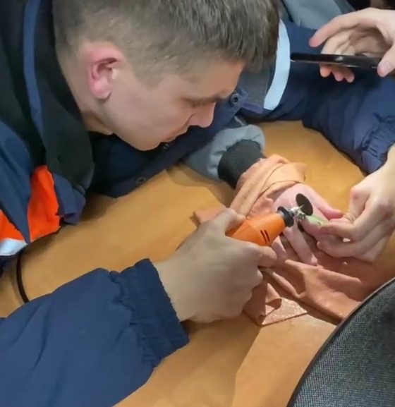 Вечером в 18:30 на линию помощи позвонил мужчина — палец его племянника распух, а кольцо из хирургической стали никак не поддавалось. Операция длилась более 50 минут. Электрическим гравером спасатели по миллиметру спиливали металл.
