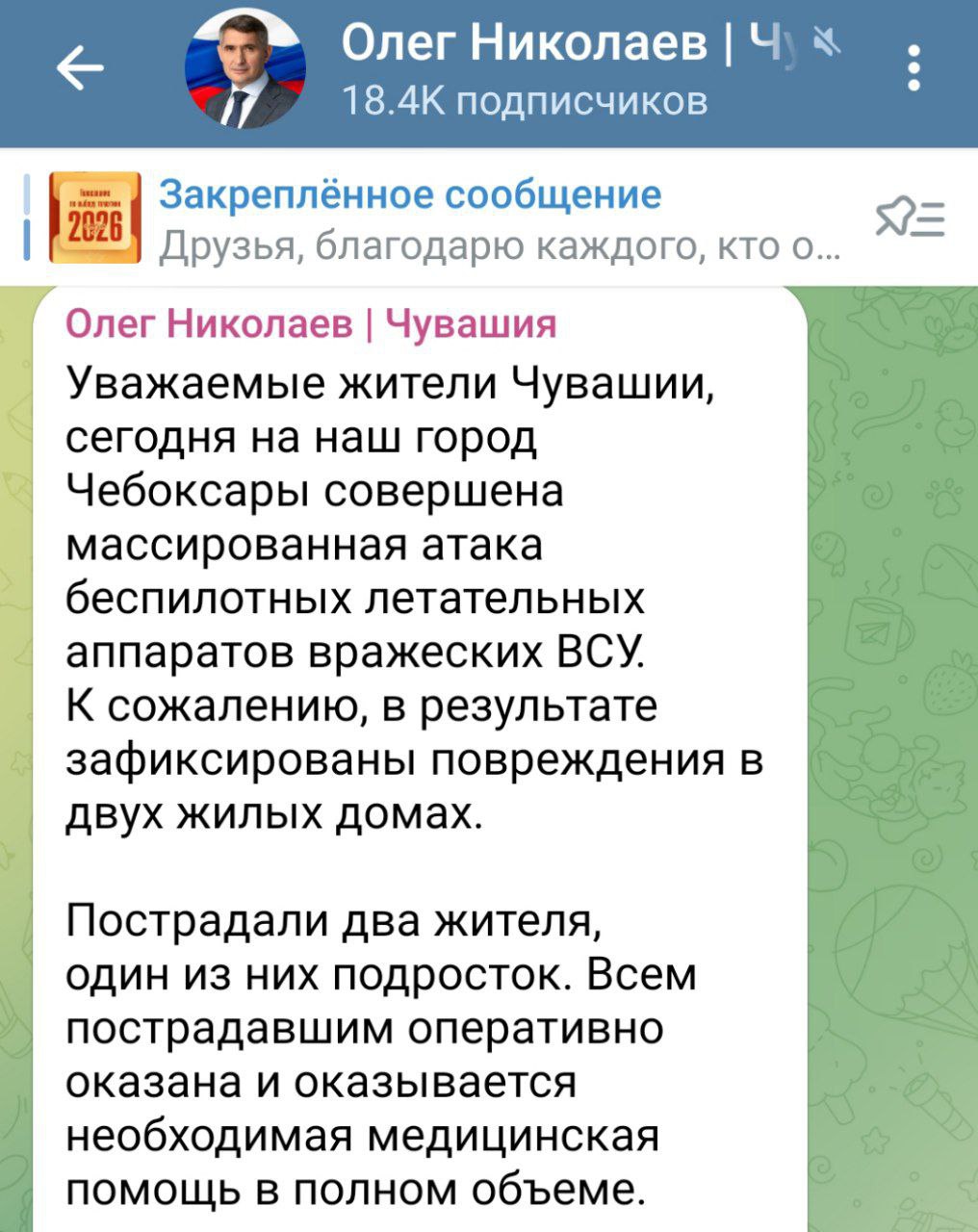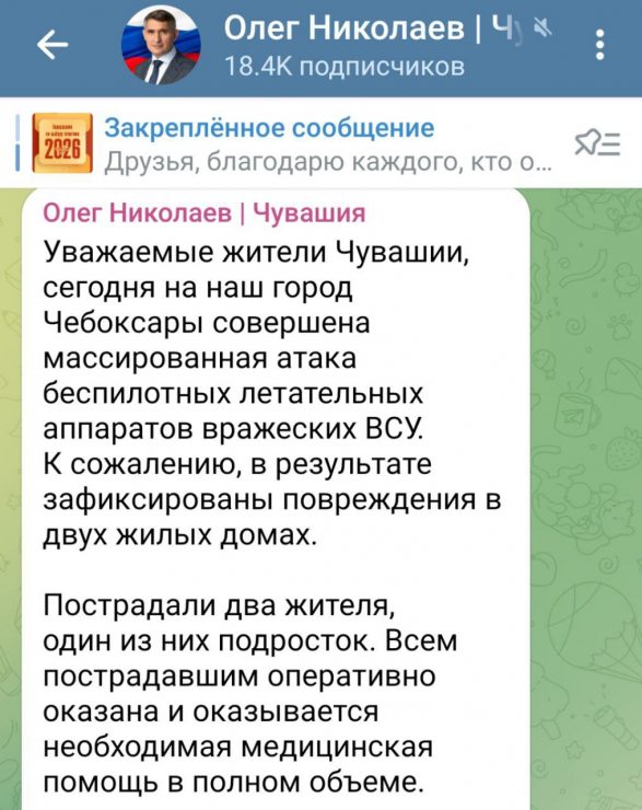 «На данный момент ситуация полностью под контролем, угроза атаки отсутствует. Все экстренные службы продолжают работу на месте происшествия, оперативно устраняя последствия»,- сообщил Глава Чувашии Олег Николаев в своем телеграм-канале.