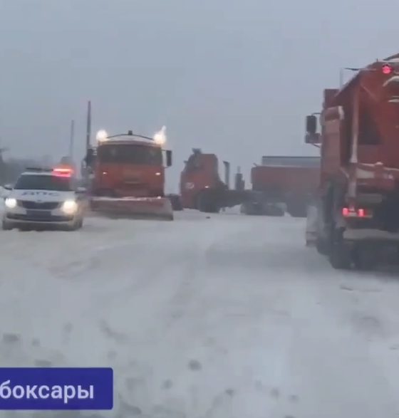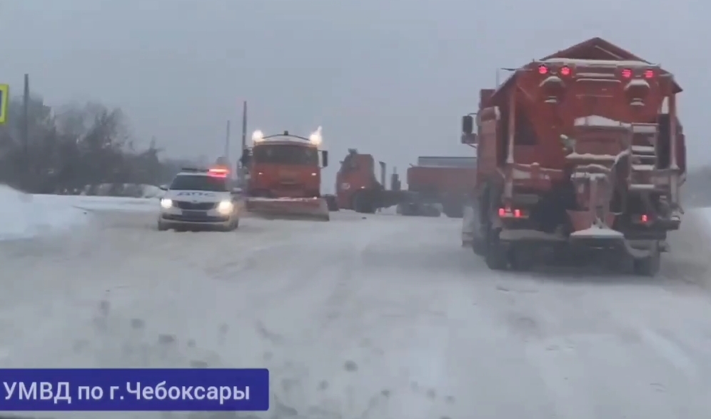 Патрульные автомобили Госавтоинспекции сопровождают снегоуборочную технику в Чебоксарах