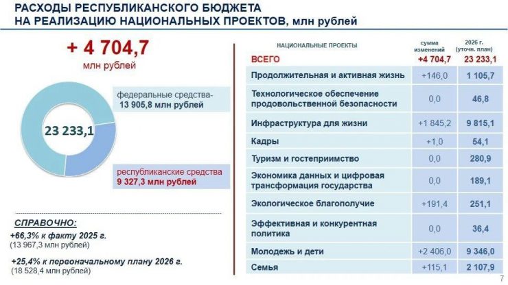 Согласно скорректированному бюджету республики на 2026 год, расходы на национальные проекты выросли на 4,7 млрд и достигли рекордных 23,2 млрд рублей. Такого объема финансирования в регионе еще не было, уточнил вице-премьер Михаил Ноздряков.