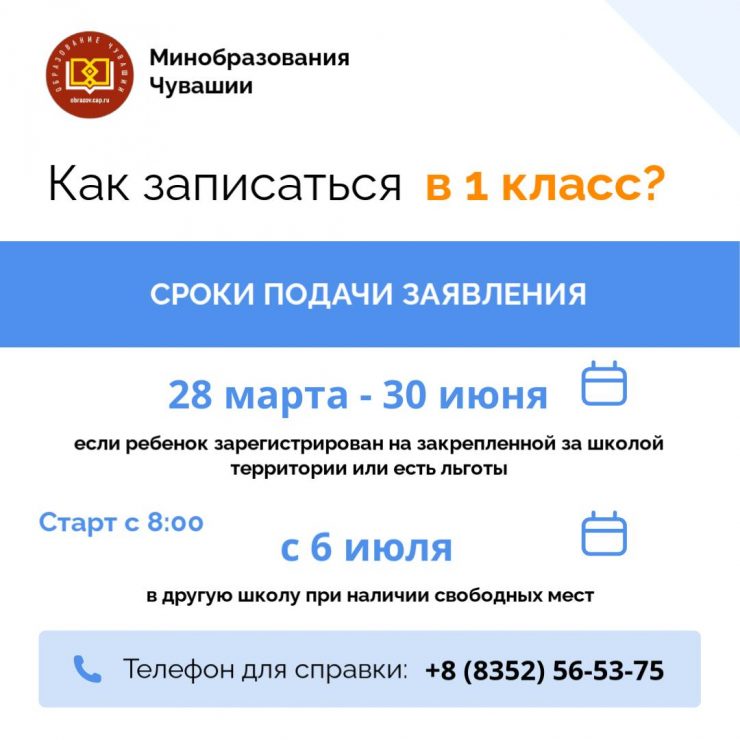 Приёмная кампания в первый класс в этом году начнётся 28 марта. Руководитель Минобразования Чувашии рекомендовал родителям изучить подготовленную ведомством инфографику с правилами приёма и списком необходимых документов.